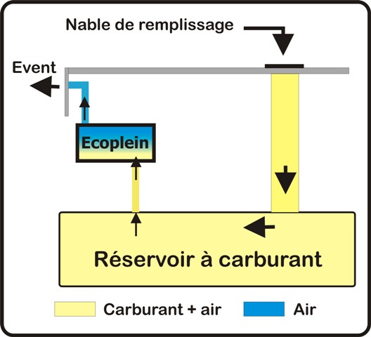 Lors du remplissage du réservoir, le carburant venant du tuyau de dégazage est récupéré dans la réserve. Le carburant monte dans cette réserve jusqu'au flotteur au contact de celui-ci un buzzer et un voyant rouge prévient que le réservoir est plein.
